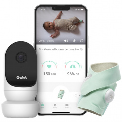 - Owlet Smart Sock and Camera Kit, conexiune la aplicația mobilă, alerte sonore și de mișcare, detectarea plânsului, tehnologie predictivă de somn, clipuri video, 4 șosete într-un pachet