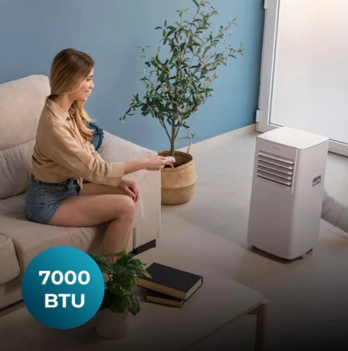 - Aparat de aer condiționat mobil - putere de răcire de 12000 BTU/h, potrivit pentru încăperi de până la 122 m³, zgomot de 64 dB(A), clasă energetică A++, funcție de dezumidificare, încălzire, ventilator, roți pentru deplasare, mod nocturn, conexiune Wi-Fi, programator de 24 de ore, telecomandă, aplicație mobilă, filtru lavabil, ecran digital, dimensiuni 77x41x44 cm.