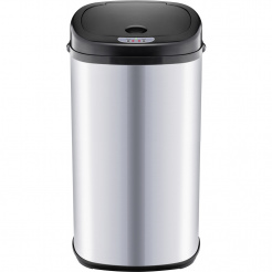 • Coș fără contact cu senzor - Volum recipient 40 litri, Dimensiuni 60 × 32 × 27,3 cm, Alimentare 4× baterii AA, Design liber poziționabil, Combinație negru și argintiu, Recipient simplu din plastic și metal, Operare igienică fără atingerea capacului
