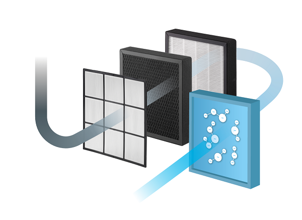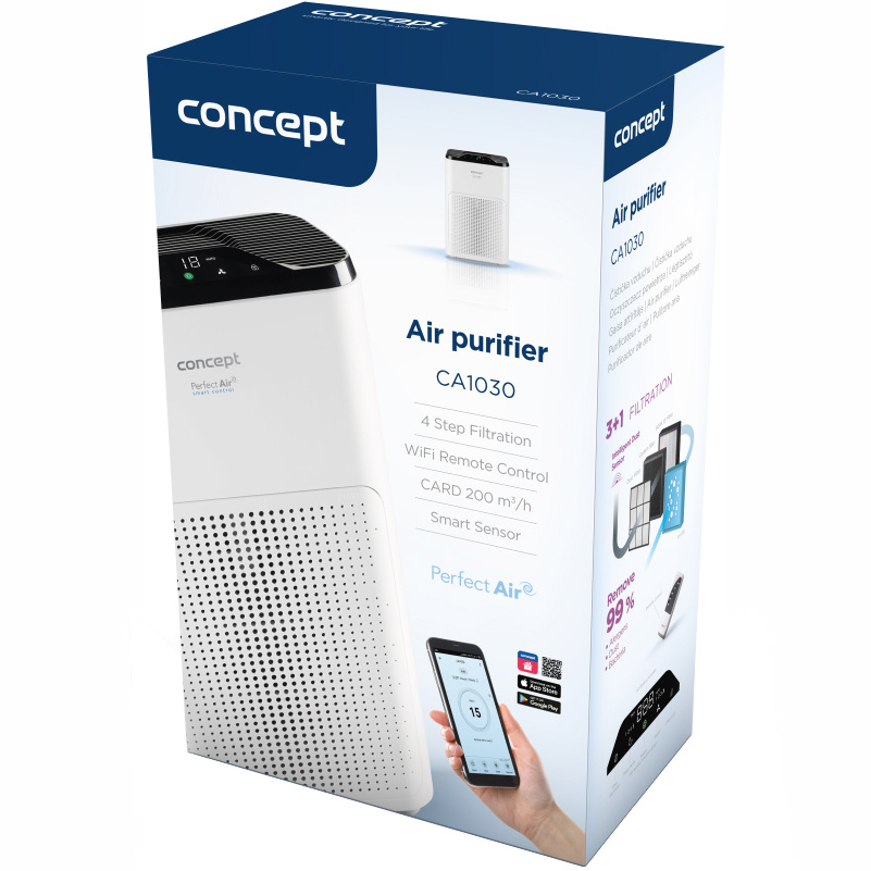 Purificatorul de aer Concept CA1030 Perfect Air Smart are un sistem de filtrare 4x format dintr-un filtru de praf care captează murdăria grosieră din aer. Următorul filtru este un filtru de carbon, care absoarbe gaze și vapori toxici, sufocanți și alte mirosuri de diferite origini, cum ar fi formaldehida (eliberată de ex. din podele noi, mobilier sau materiale de construcție), benzen sau fum de țigară. Al treilea filtru HEPA 13 captează particule de 0,1 micrometri cu o eficiență de 99,9% (praf, polen, fum, bacterii, viruși, alergeni, spori de mucegai etc.) și în cele din urmă un ionizator, care crește cantitatea de ioni încărcați negativ în aer, care îmbunătățesc calitatea generală a aerului și au un efect pozitiv asupra calității respirației, a psihicului uman, a concentrării, a performanței și ajută împotriva durerilor de cap. În același timp, absoarbe particulele încărcate pozitiv de praf, viruși și bacterii.