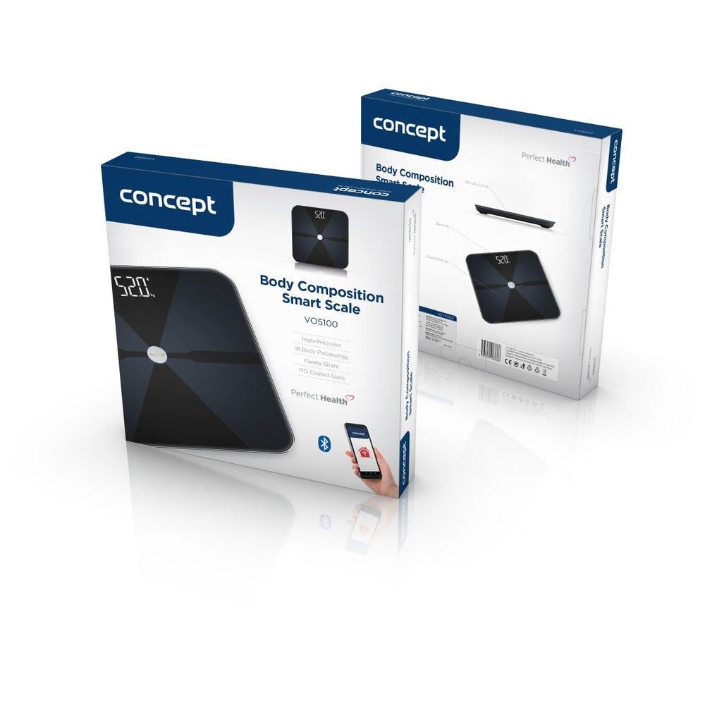 Cântarul personal inteligent Concept VO5100 Perfect Health vă ajută să vă urmăriți sănătatea simplu și clar. În plus față de greutatea corporală propriu-zisă, acesta oferă o analiză detaliată a compoziției corporale pentru a vă oferi o idee mai bună despre condiția dvs. fizică și progresul dvs. Cântarul are o capacitate de greutate de până la 180 de kilograme și măsoară până la cea mai apropiată 100 de grame. Designul minimalist elegant, într-o combinație de negru și placă de sticlă albastru închis, cu o grosime de 5 milimetri și designul jos îl fac un accesoriu elegant care se va potrivi în mod natural în orice baie sau interior.
