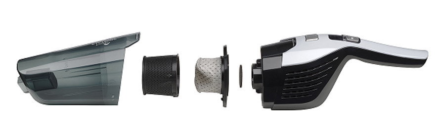Aspiratorul este încărcat cu ajutorul unui adaptor și încărcarea completă durează doar 4-5 ore. Datorită mânerului pliant, ocupă și un spațiu minim.