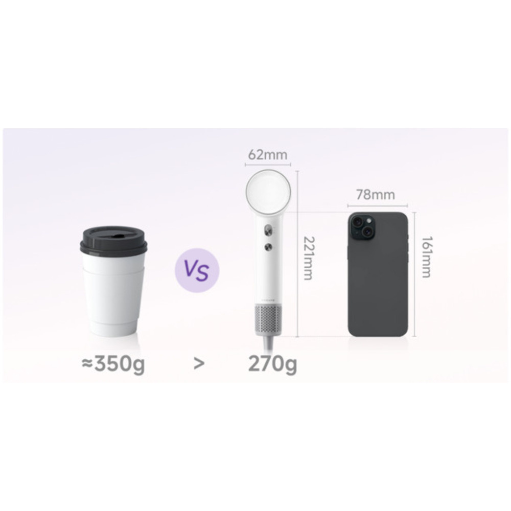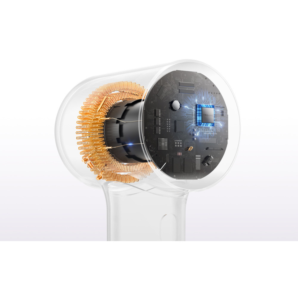 În inima mini uscătorului de păr Dreame se află un motor avansat de mare viteză cu 100.000 rpm. Acesta generează un flux de aer puternic de până la 70 m/s la viteză mare și 55 m/s la viteză mică. Cu toate acestea, dispozitivul cântărește doar 270 de grame și are un diametru de doar 62 de milimetri, asigurând o manevrare confortabilă și un styling precis.