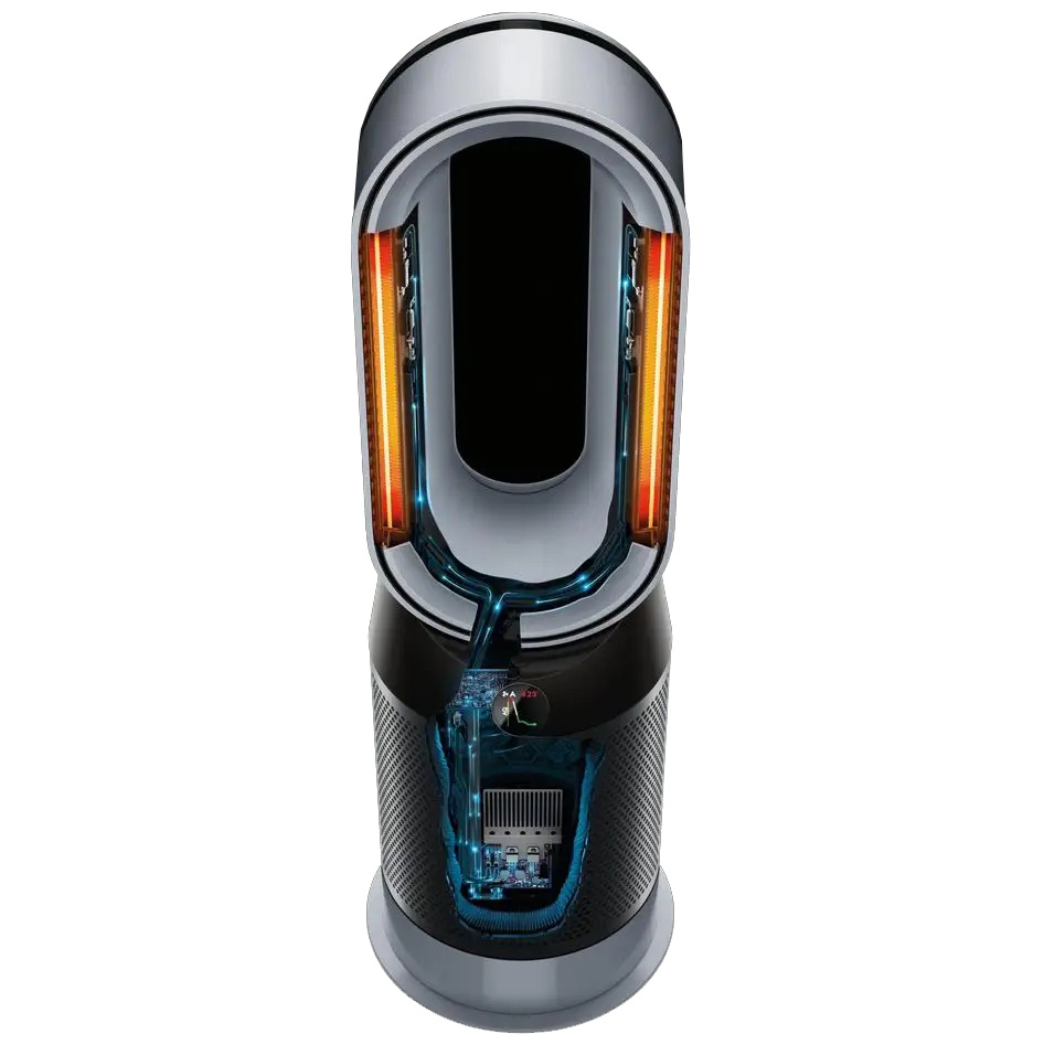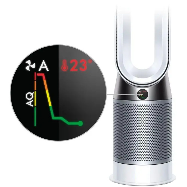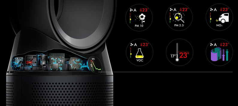 Purificatorul de aer Dyson Pure Hot + Cool HP04 are doi senzori încorporați care analizează calitatea aerului din cameră. Detectează automat particulele și gazele din aer. Acesta le analizează și le informează în timp real. Senzorul de praf detectează particulele de praf și alergenii, în timp ce senzorul organic reușește să capteze fum și toxine. Vă va arăta rezultatele direct pe ecranul LCD de pe corpul purificatorului sau în aplicația mobilă.