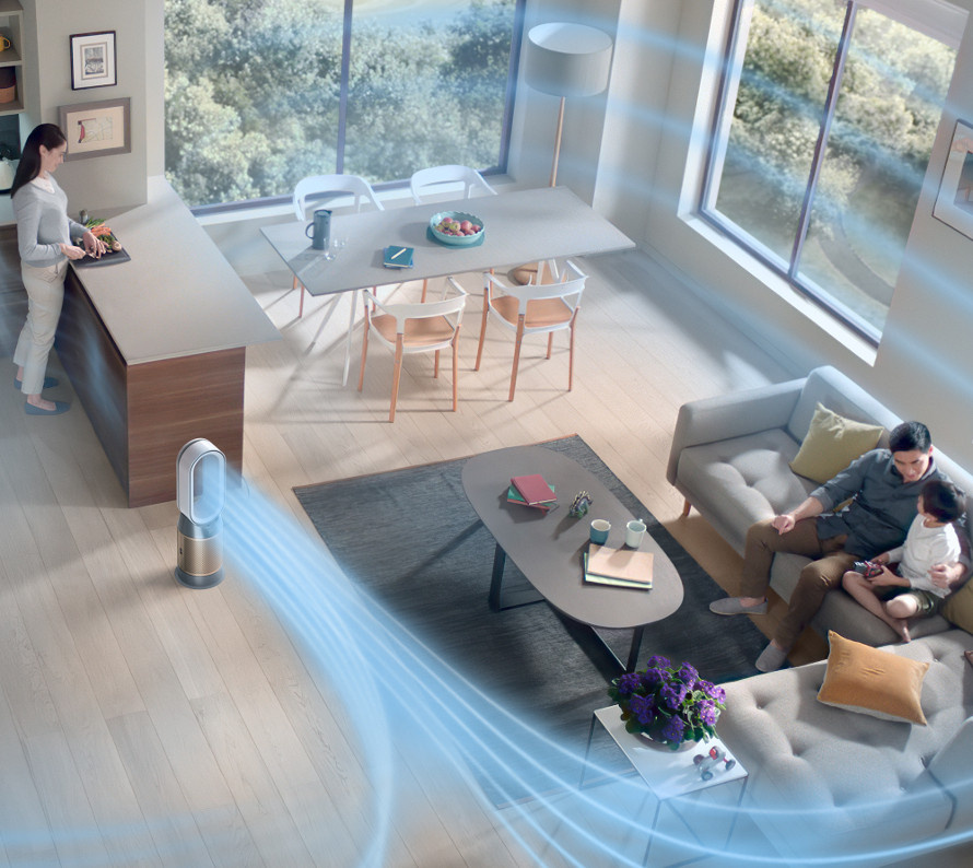 Tehnologia Air Multiplier eliberează aerul purificat, care este ulterior pus în mișcare și amestecat cu aerul din cameră pentru o acoperire completă.