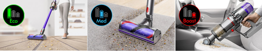 Dyson V11 Motorhead are trei moduri de aspirare, și anume „Auto” pentru aspirarea mai puternică, „Eco” pentru aspirarea zilnică și „Boost”, cu care puteți aspira chiar și zonele puternic murdare.