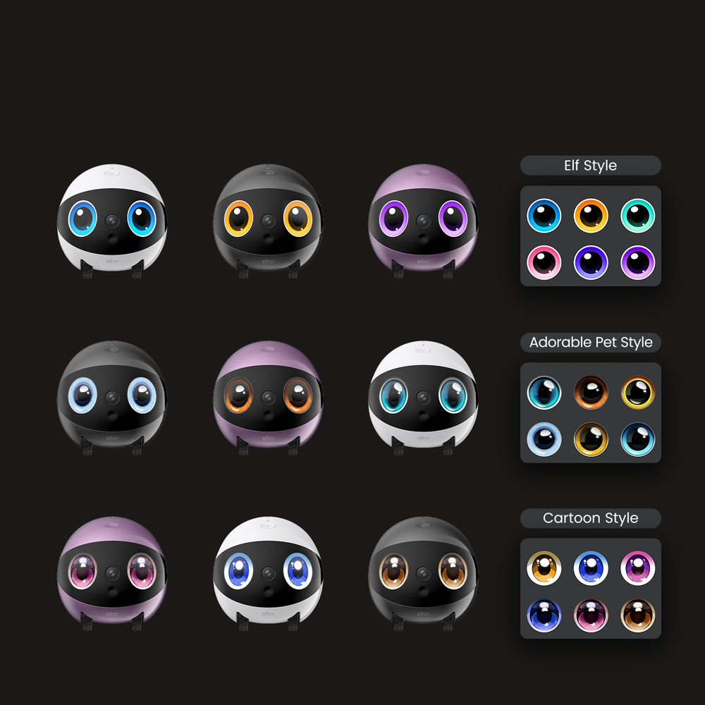 Două afișaje digitale care înlocuiesc ochii îi conferă lui EBO Air 2 Plus personalitate și emoție. Utilizatorii pot ajusta culoarea, stilul și animațiile pentru a adapta aspectul robotului la starea lor de spirit sau la mediu. Ochii reacționează la diferite situații - de exemplu, atunci când vorbește, se încarcă sau se mișcă - pentru a crea o impresie vie și prietenoasă.