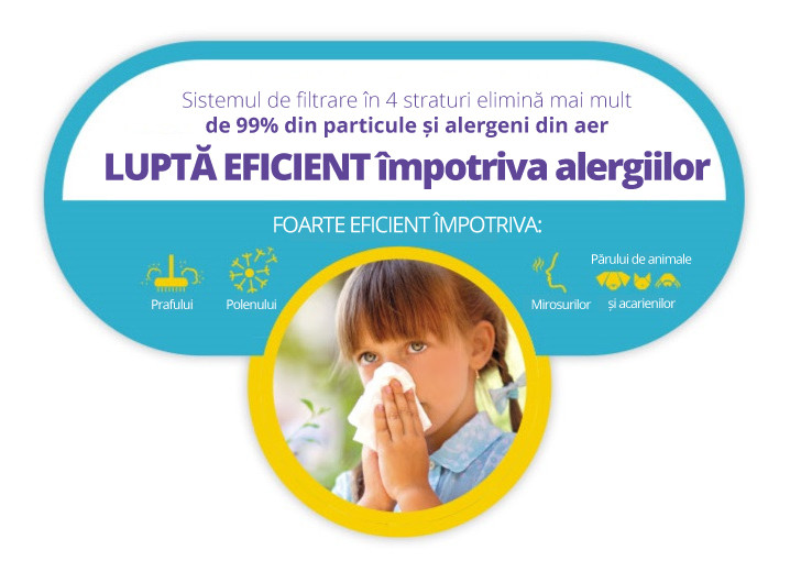 - Filtrul HEPA are o eficiență ridicată și captează praf, polen, acarieni și diverși alergeni