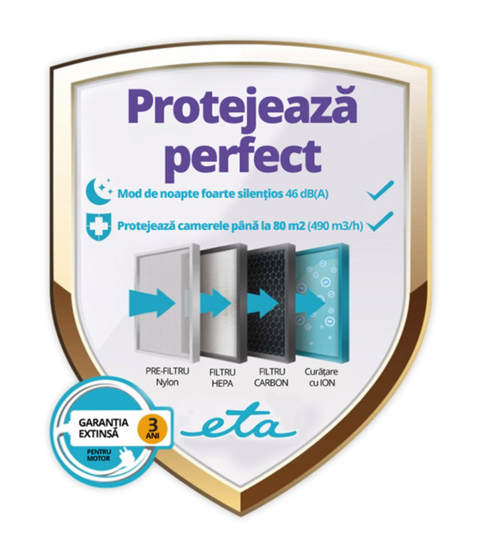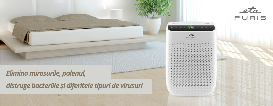 Purificatorul de aer ETA Puris este puternic, având o putere de 46,2 W, și este potrivit pentru toate locuințele care se confruntă cu o poluare crescută a aerului, în care trăiesc persoane care suferă de alergii sau cu animale de companie. Are un nivel excelent de filtrare, cu o eficiență de până la 99,97%, și captează inclusiv mirosurile neplăcute și părul de animale. Obține aceste rezultate remarcabile datorită unui filtru HEPA extrem de eficient, completat de un filtru de carbon și un pre-filtru de nailon.