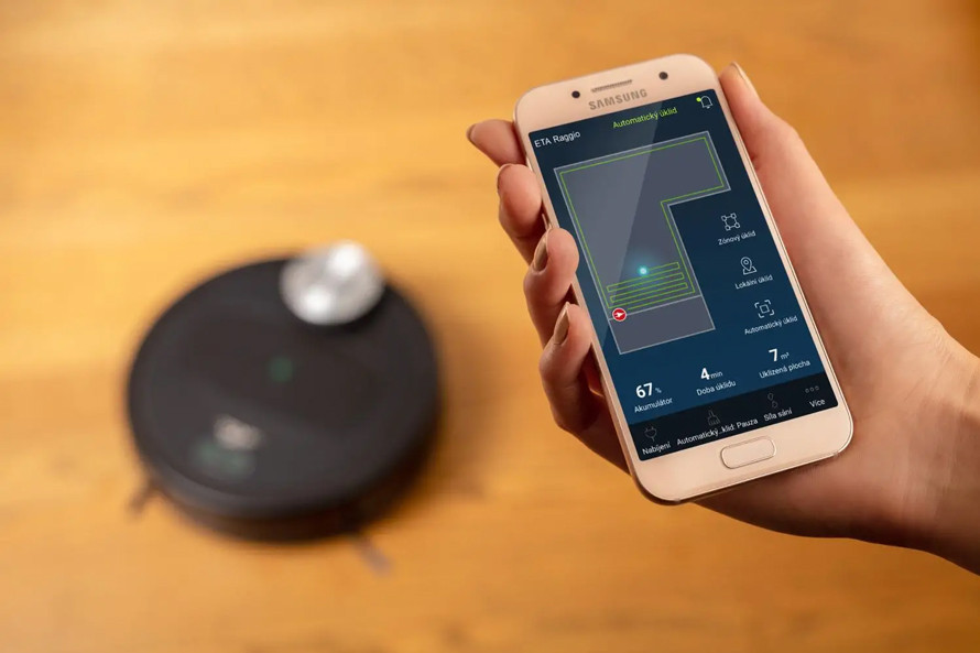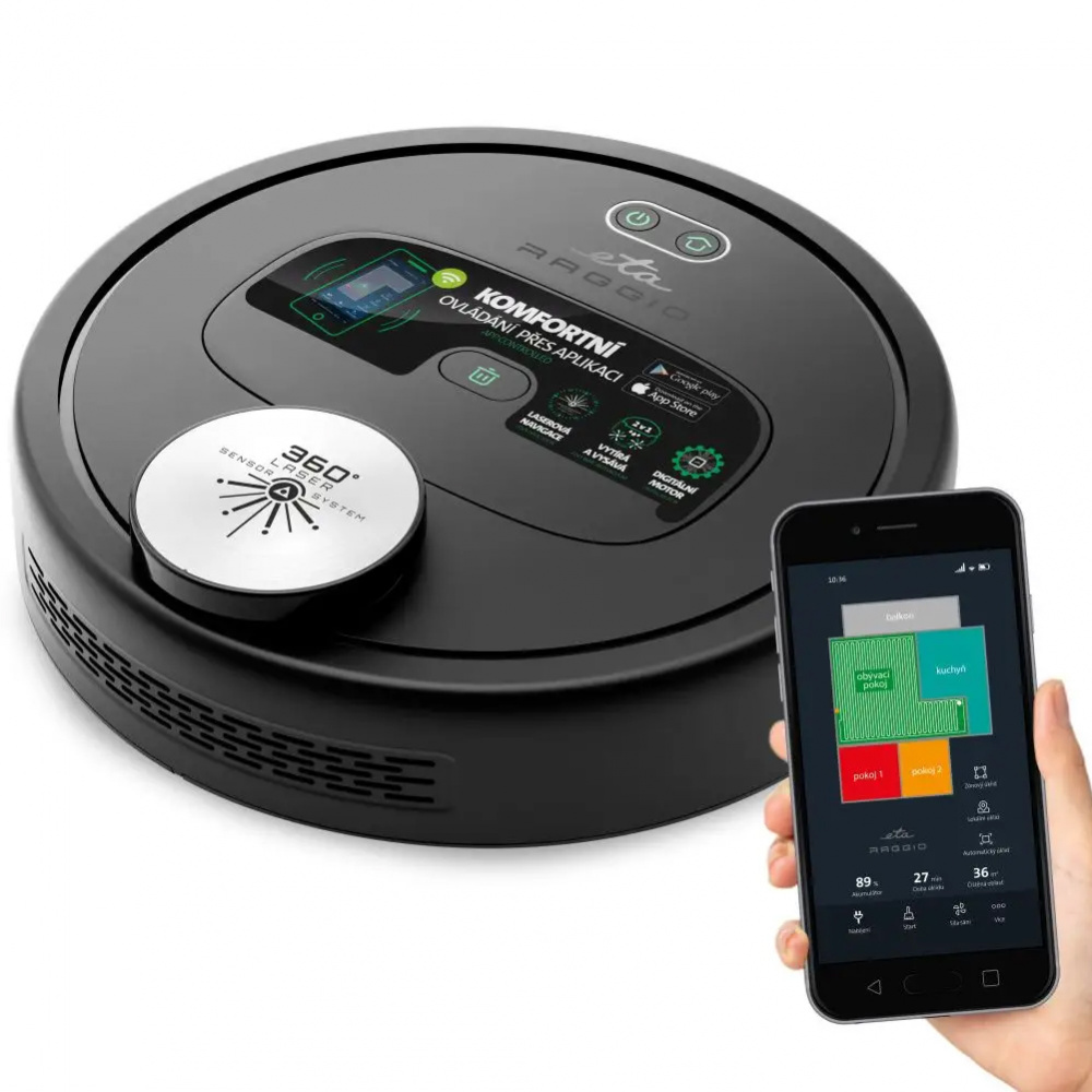 Aspiratorul robot ETA Raggio este puternic, aspiră perfect podeaua și o șterge în același timp. Este perfect orientat în spațiu datorită ghidajului cu laser și îl puteți controla cu ușurință de pe telefonul mobil sau de pe tabletă - descărcați APLICAȚIA gratuită pentru iOS sau Android.