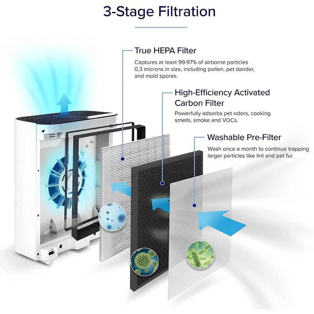 Al doilea strat este un filtru HEPA. Îmbunătățit cu fibre încărcate static care captează cel puțin 99,97% din particulele din aer cu dimensiuni de până la 0,3 microni, cum ar fi praful fin, particulele de fum, mucegaiul, bacteriile, polenul, particulele de fum, acarienii și părul animalelor de companie. Acest lucru diferențiază Levoit de concurență, deoarece filtrele HEPA sunt de o calitate mult mai ridicată și mai fiabile decât filtrele utilizate în mod obișnuit.