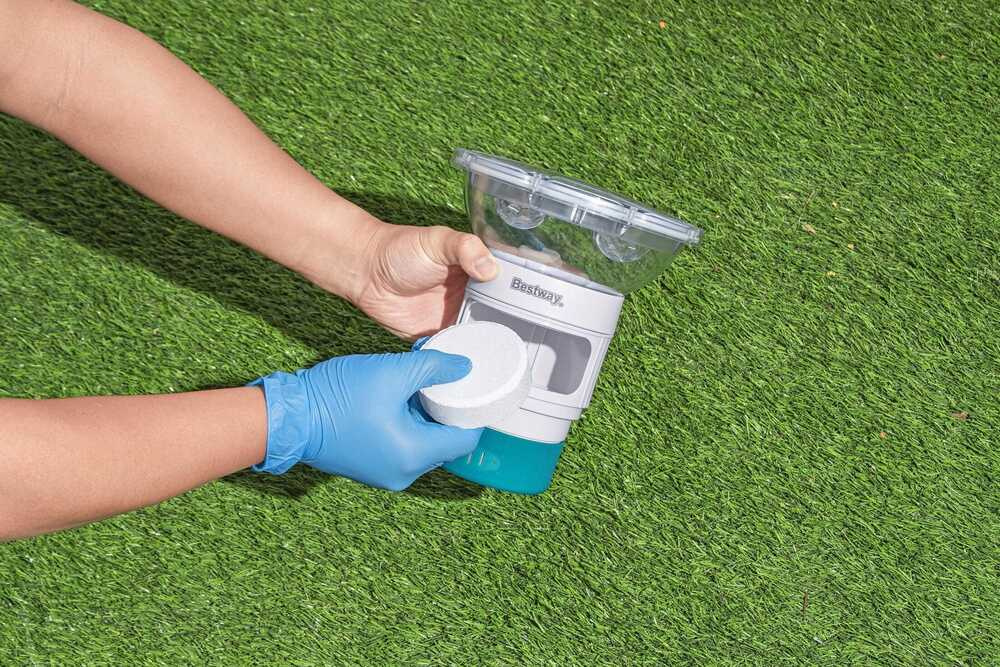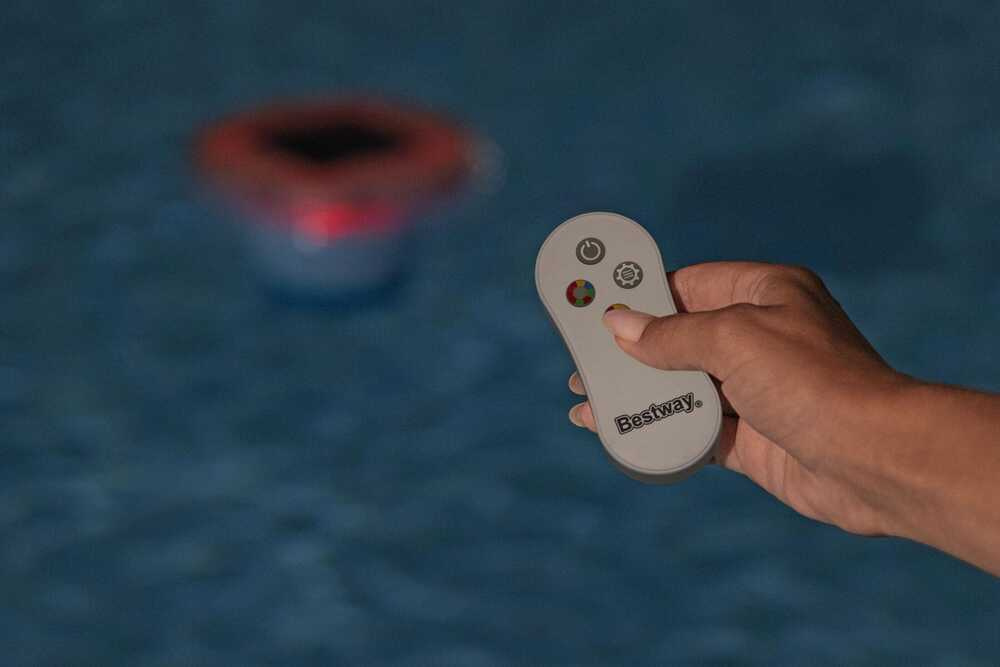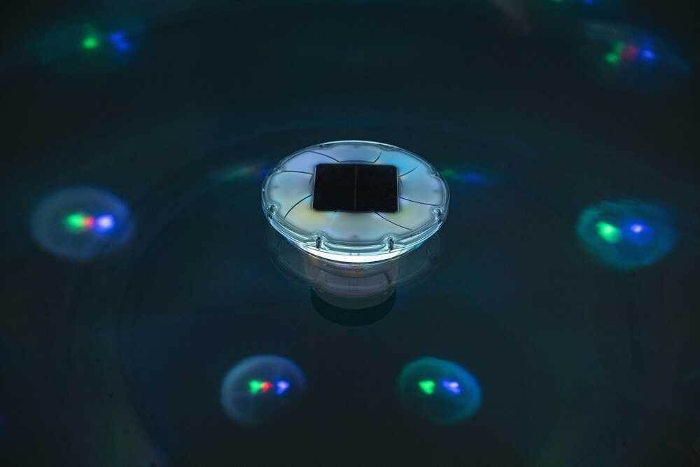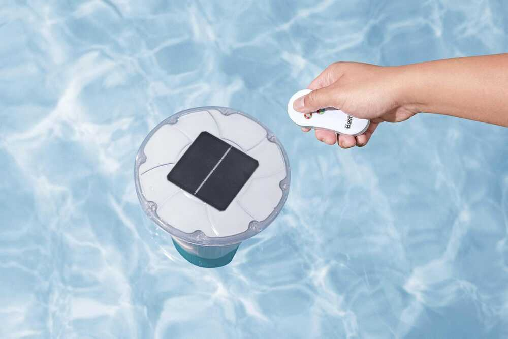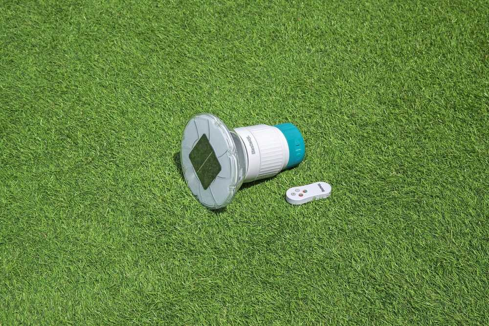 Dispenserul solar SolarGlow™ de la Bestway este o combinație inovatoare de îngrijire practică a apei din piscină cu un design spectaculos de iluminat. Dispozitivul acționează ca un distribuitor fiabil de tablete de brom și clor, conținând până la trei bucăți cu diametrul de 7,6 cm. De îndată ce soarele apune, un senzor automat de lumină activează LED-urile colorate, care vă pot lumina suprafața apei timp de până la opt ore.