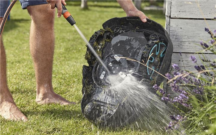 Gardena Sileno city 500 smart este construită astfel încât un jet simplu de apă din furtunul de grădină va îndepărta murdăria, praf și reziduurile de iarbă de pe carcasa, cuțitele și roțile.