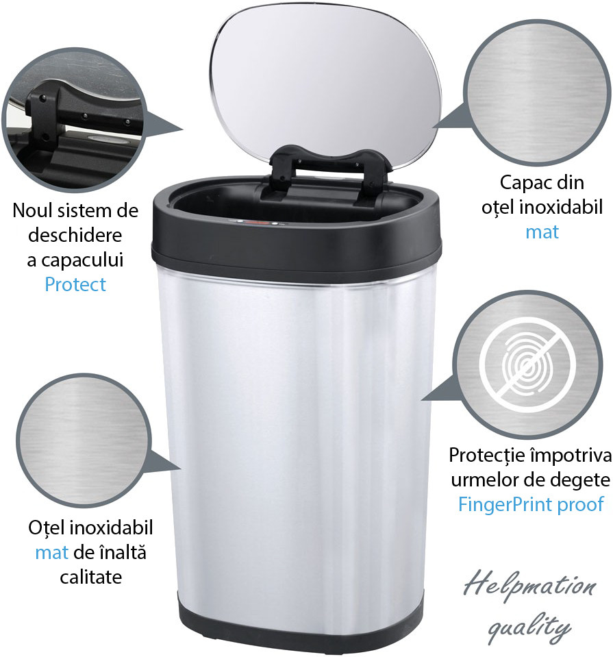 Coșul de gunoi fără contact garantează igiena maximă și utilizare ușoară. Puteți avea mâinile pline cu deșeuri, capacul coșului se va deschide și închide automat după introducerea deșeurilor. Acest sistem este foarte igienic și asigură reducerea apariției bacteriilor. Deschiderea și închiderea coșului Helpmation este controlată de un cip inteligent.