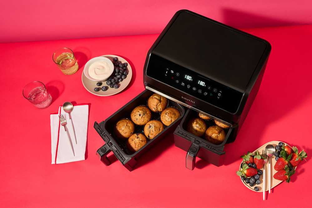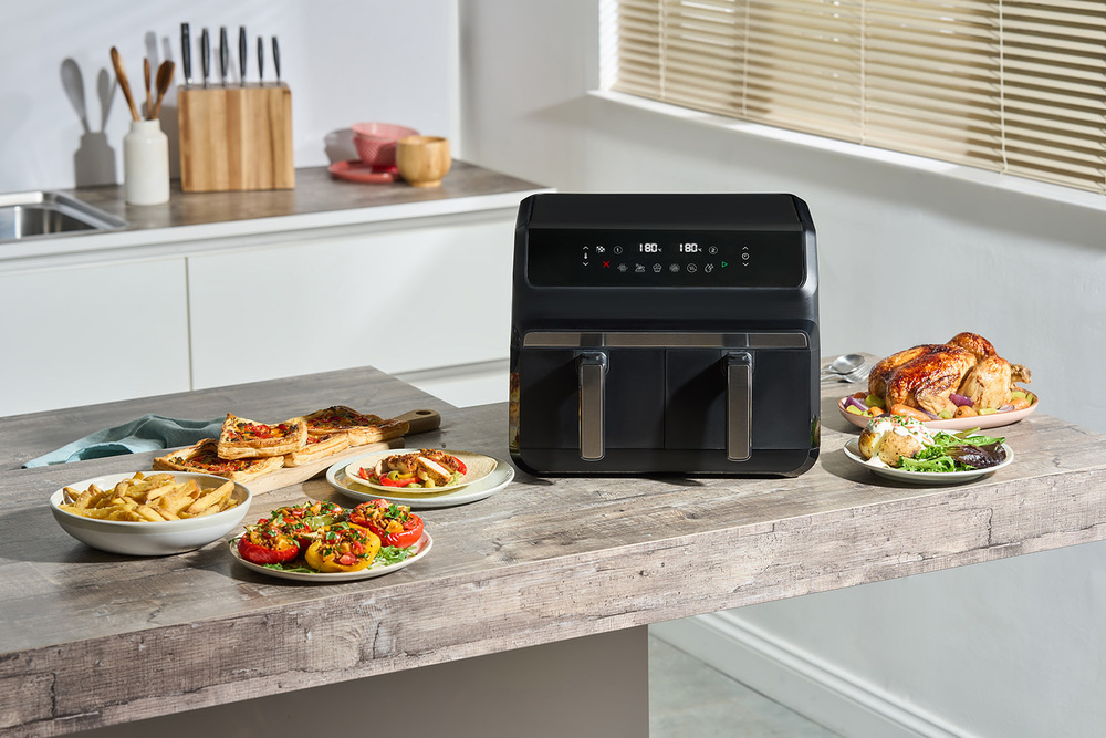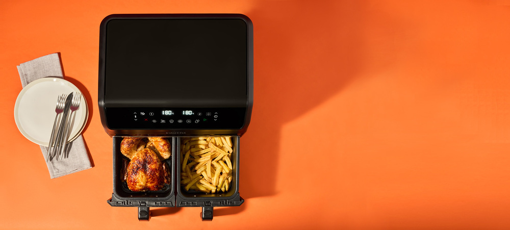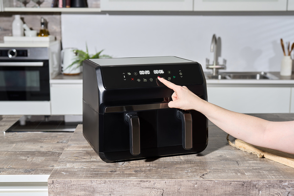 Vortex Dual 8L Air Fryer vă revoluționează bucătăria cu două coșuri spațioase de 4 litri. Acest design inovator vă permite să pregătiți diferite feluri de mâncare în același timp - în timp ce într-un coș pregătiți cartofi prăjiți crocanți, în acesta din urmă poate apărea pui suculent. Cu caracteristici avansate SyncCook™ a SyncFinish™ aveți control total asupra timpului. SyncCook™ vă permite să duplicați setările pentru ambele coșuri, în timp ce SyncFinish™ sincronizează diferite feluri de mâncare astfel încât acestea să fie gata în același timp.