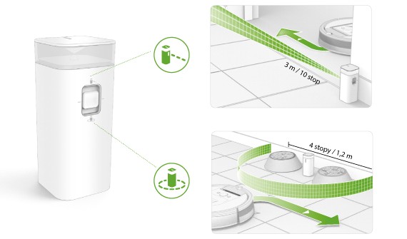 - Modul zonă de protecție „HALO”: Când butonul este în poziția „în jos”, unitatea creează o zonă de protecție în care Roomba nu va intra. Acest lucru împiedică robotul să lovească în obiecte pe care doriți să le protejați (de exemplu, un bol cu mâncare pentru câini sau o vază) sau să se mute în locuri unde nu doriți (de exemplu, într-un colț cu cabluri sau sub o masă). Zona de protecție este invizibilă și se extinde la maximum 60 de centimetri de centrul dispozitivului.