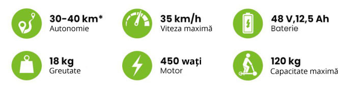 Trotineta electrică Vivax MS Energy e10 este noua serie E si este mijlocul de transport ideal pentru mersul zilnic. Bateriile puternice, un motor puternic cu trei viteze și o bandă de rulare din silicon mai mare vă asigură o călătorie ideală cu o autonomie de până la 40 km și o viteză maximă de 35 km/h. Datorită roților mari de 10" cu cauciucuri gonflabile și a două amortizoare cu arc moale, pe roata din față și din spate, călătoria este plăcută și cu ușurință, iar fără a zdrobi dinții, poate face față diverselor terenuri blânde. Construcție metalică mai grea cu o greutate de 18 kg. nu mai este frecventă, dar designul compact și portabilitatea rămân încă pe modelele E. Ecran tactil LCD modern. Puteți monitoriza toate datele în aplicația mobilă MS Energy e.