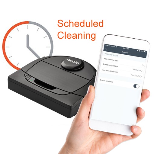 Aspiratorul robot Neato puteți programa cu ușurință pentru aspirare în fiecare zi sau în funcție de programul care vi se potrivește cel mai bine. La întoarcerea acasă, vă puteţi bucura de podelele curăţate.