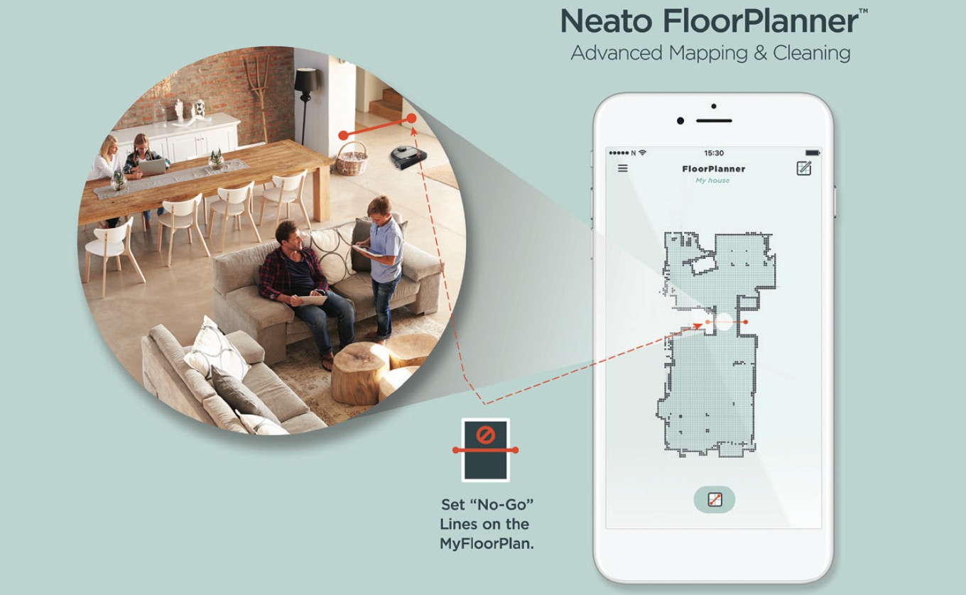 Până acum, Neato folosea benzi magnetice pentru a defini spațiul în care nu vroiai ca robotul să meargă. Neato oferă o nouă funcție de linii No-Go direct în Neato Floor Planner ™. Pur și simplu marcați pe harta aspiratorului linii pe care nu le va depăşi. Puteți să-i interziceți să aspire în jurul castroanelor animalelor de companie sau chiar în locuri temporare în care se joacă copiii.