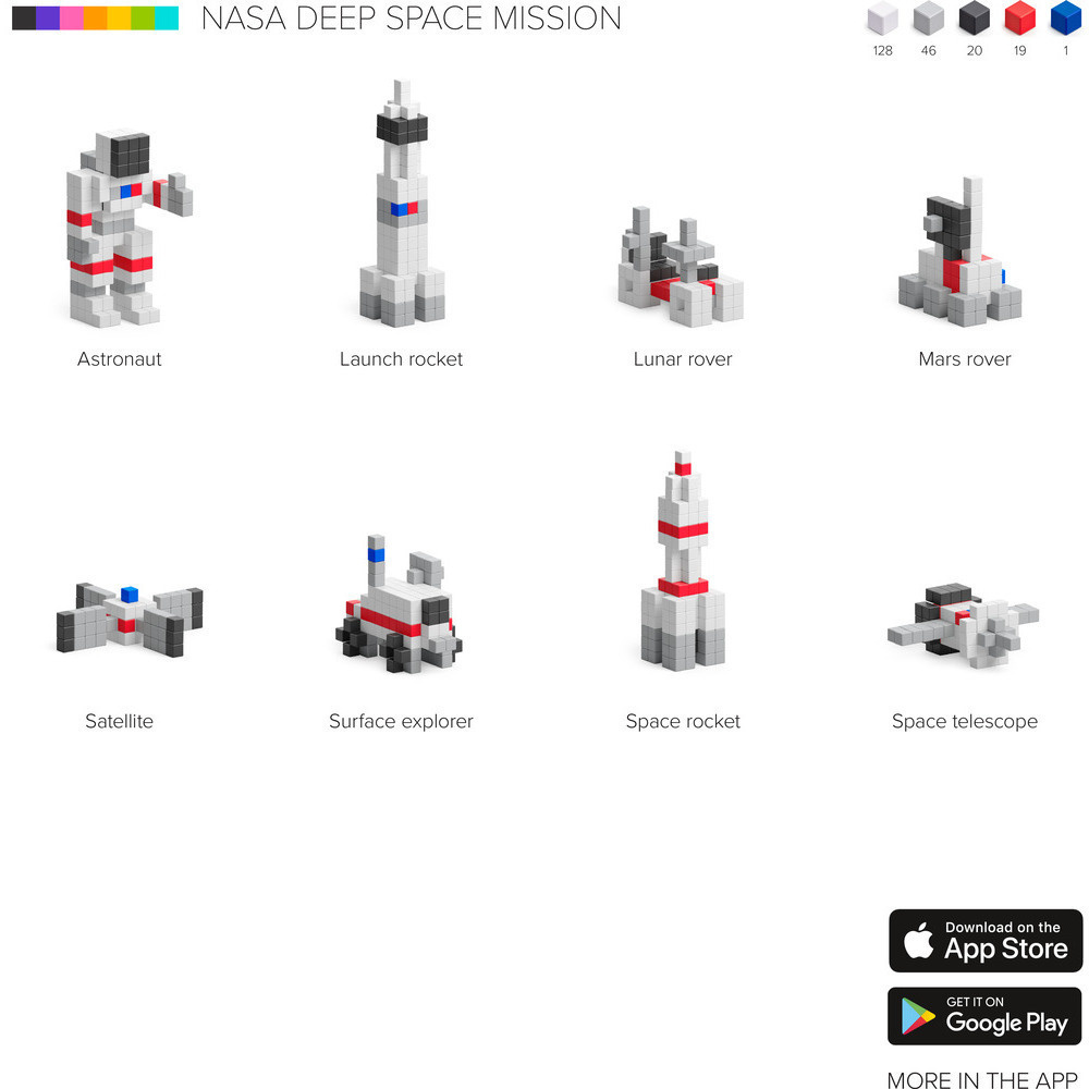 PIXIO NASA Deep Space Mission DESIGN SERIES conține 214 blocuri PIXIO în 6 culori. Acestea vor da viață ideilor tale creative și vor aduce bucurie colorată în viața ta. Începeți prin a construi modele simple urmând instrucțiunile și apoi treceți la crearea propriilor modele atunci când sunteți gata. Cu acest kit puteți construi un astronaut, un rover lunar, o rachetă, un satelit, un telescop și multe altele. Pixio este un vis devenit realitate pentru fanii Pixel Art și jucătorii Minecraft. Folosiți-l ca o resursă de învățare pentru a dezvolta creativitatea copiilor. Include 5 culori pentru a vă ajuta să transformați forme simple în obiecte și personaje minunate (alb 128x, gri 46x, negru 20x, roșu 19x, albastru 1x).