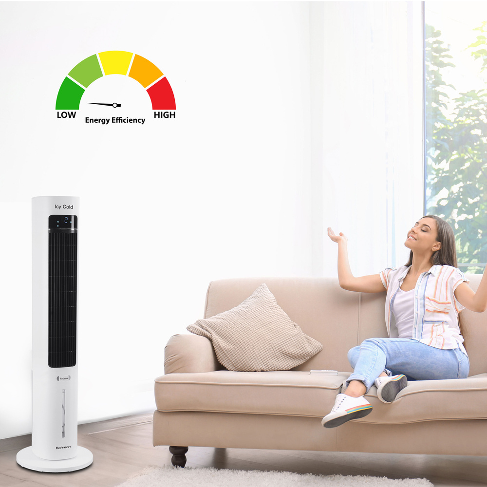 Elegantul răcitor de aer Rohnson R-8802, cu un design modern în culoare albă, reprezintă o alternativă ecologică la aparatele de aer condiționat clasice. Datorită debitului puternic de aer de 450,24 m³/h și rezervorului generos de apă cu o capacitate de 3 litri, acesta poate răci eficient încăperea cu până la 3–4 °C. Cu un consum de doar 60 W, este eficient din punct de vedere energetic, iar funcționarea sa este prietenoasă cu mediul, deoarece nu utilizează agenți frigorifici chimici.