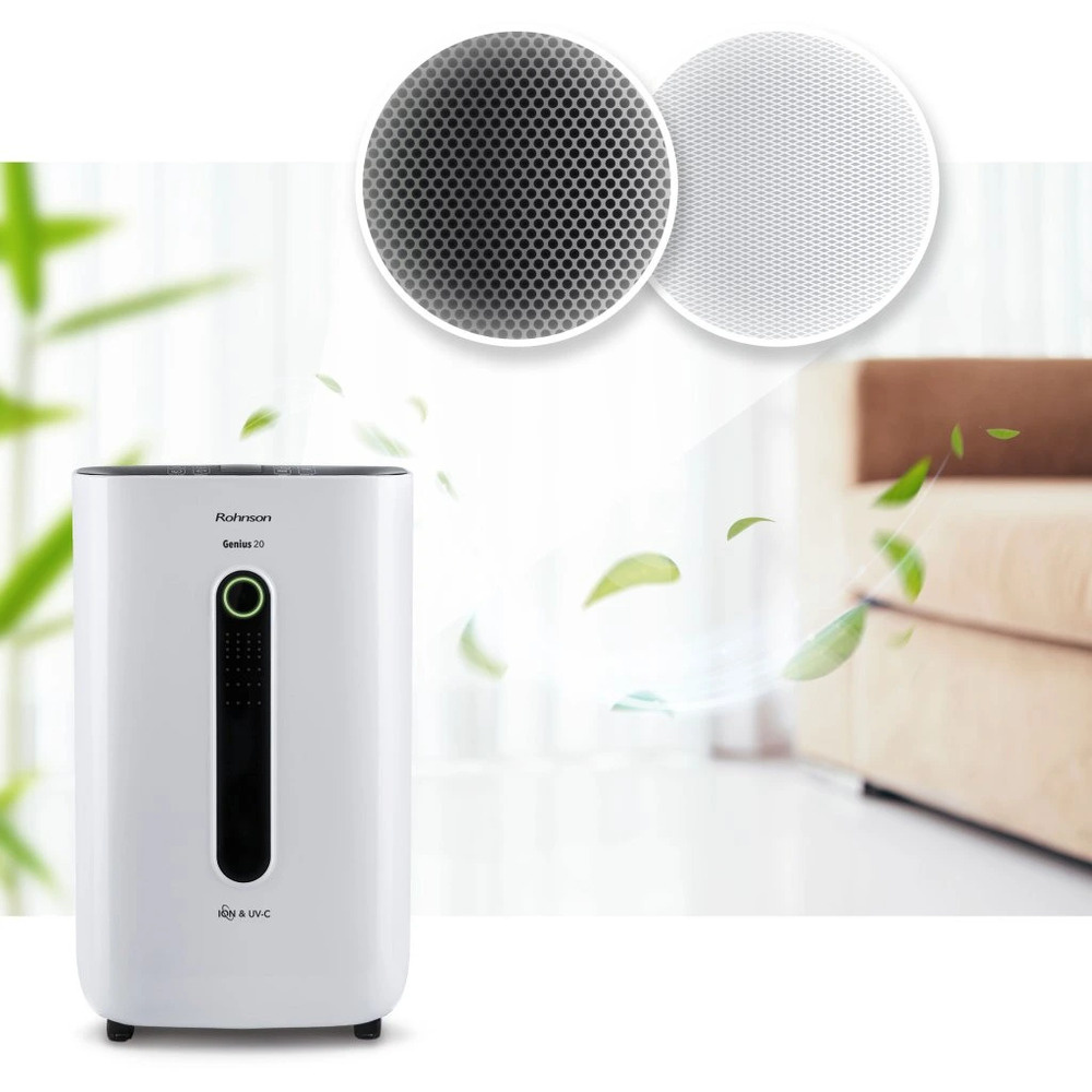 Dezumidificatorul vârf de gamă R-9920 Genius revoluționează îngrijirea calității aerului. S cu o capacitate de dezumidificare de 20 de litri pe zi reglează eficient umiditatea în încăperi de până la 120 m². Combinație unică Lămpi de sterilizare UV-C a filtru de ionizare împreună cu filtru de carbon asigură purificarea completă a aerului. Inovativ Conexiune Wi-Fi permite controlul de la distanță prin intermediul unei aplicații mobile prin care puteți seta temporizatorul, controla umiditatea și regla alte funcții de oriunde. S debit de aer de până la 195 m³/h și sistemul ergonomic de curgere atinge viteze mici de doar 36 dB, care garantează o funcționare silențioasă și eficientă.