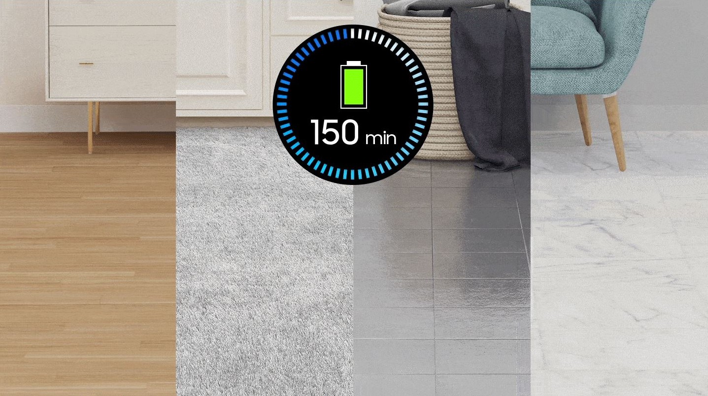 Bucurați-vă de curățarea neîntreruptă fără a fi necesară reîncărcarea. Aspiratorul pe baterii cu o capacitate mare de 3.400 mAh cu durată lungă de viață pentru până la 150 de minute. Acest lucru vă permite să curățați o zonă mare cu colțuri, fără a fi necesară o încărcare suplimentară.