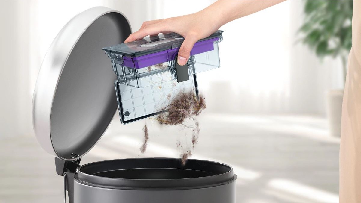 Puteți goli recipientul aspiratorului de 0,2 l fără praf inutil. Deschideți-l apăsând butonul, pliați conținutul și glisați-l înapoi. Pentru a menține recipientul curat, clătiți-l rapid cu apă. La curățare, veți aprecia cu siguranță rezervorul de apă cu un volum de 0,4 l, ceea ce va ușura mopingul.