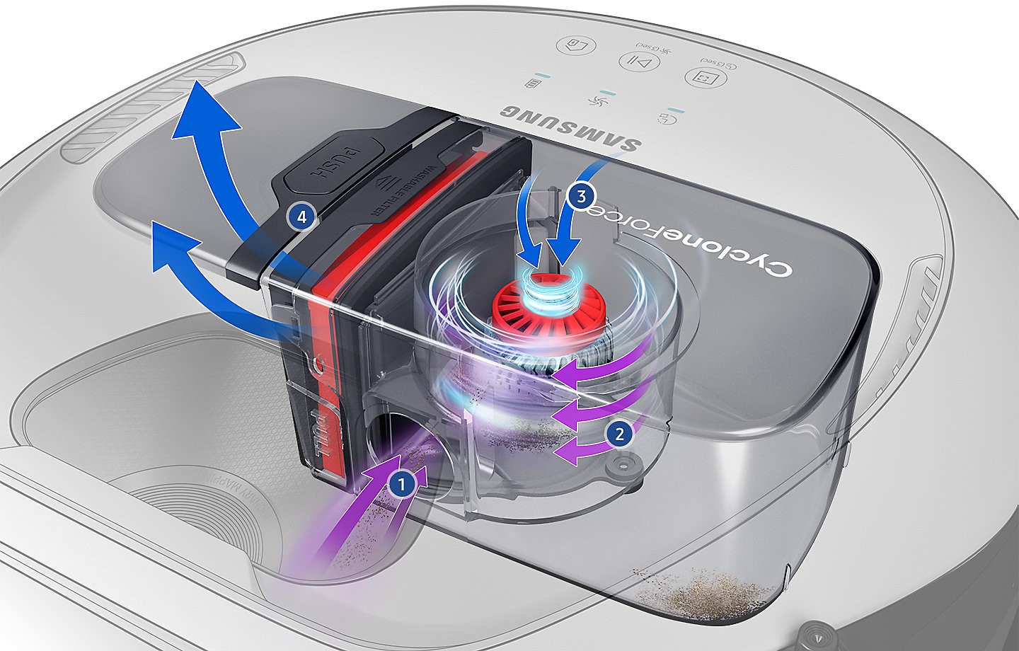 Este foarte deranjant atunci când puterea de aspirație devine din ce în ce mai slabă. CycloneForce reduce la minimum pierderea puterii de aspirație prin separarea prafului de aer folosind forța centrifugă puternică, menținând astfel filtrul curat tot timpul.