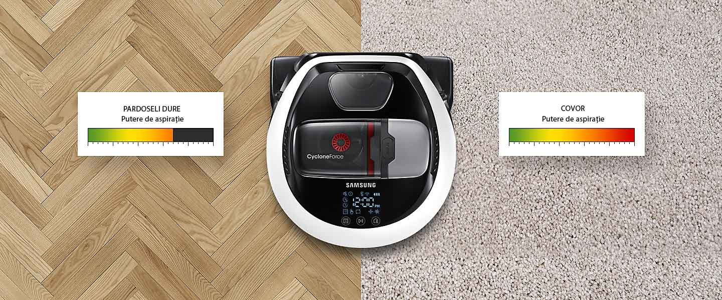 Eficiența de curățare scade atunci când se utilizează aceeași putere de aspirare pe suprafețe diferite, cum ar fi pardoseli tari, covor și linoleum. POWERbot detectează automat tipul de suprafață generând o putere de aspirare optimă. Astfel, pentru covoare și carpete puterea de aspirare generată este mai mare pentru a aspira praful din profunzime.
