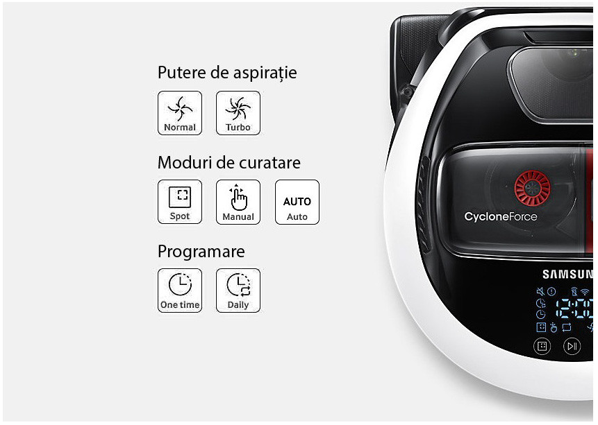 - Mod de curățare: Auto, Repeat On/Off, Manual, Spot