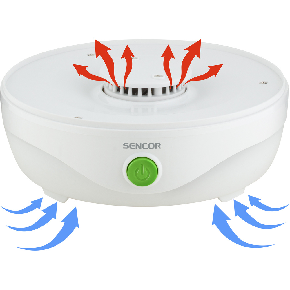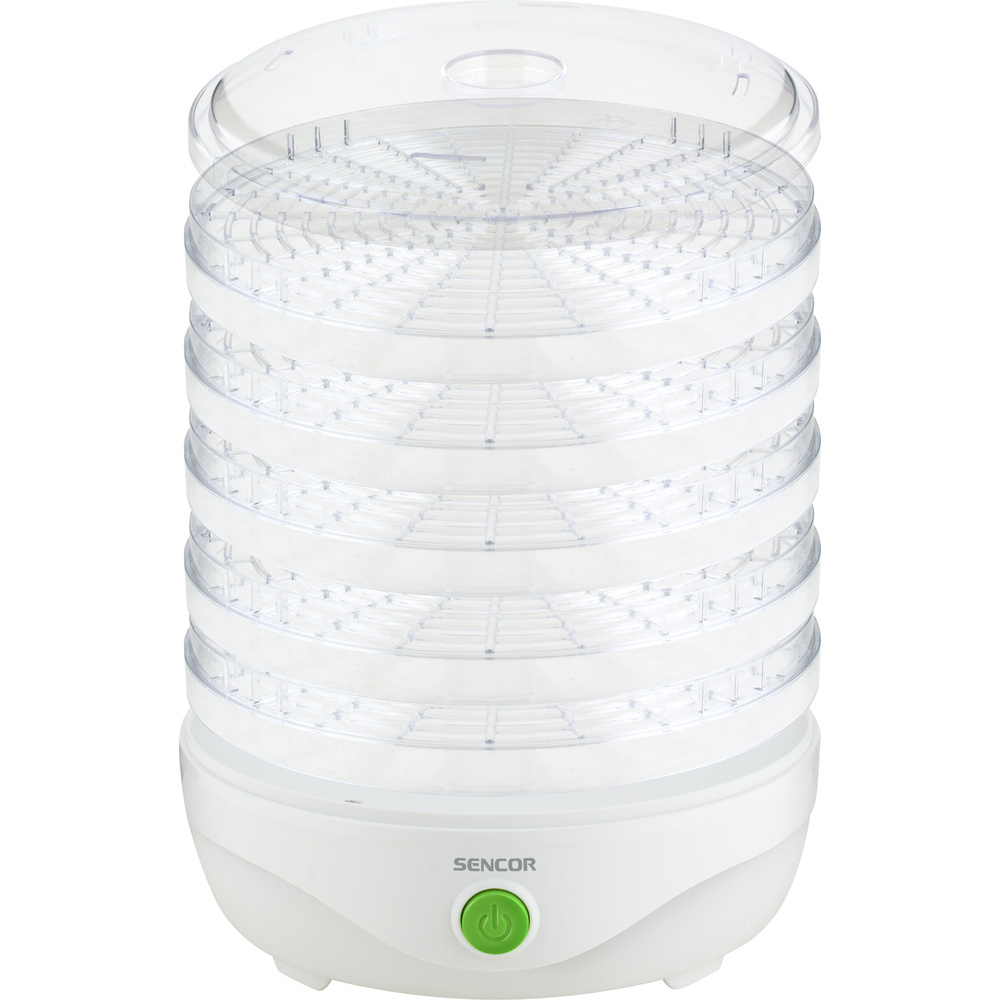 Model SENCOR SFD 750WH oferă cinci salarii practice cu o medie 23 cm și înălțime reglabilă 2,5 cm. Construcția specială cu grilaj a plăcii optimizează fluxul de aer și previne mucegaiul. Ventilatorul încorporat asigură circulația optimă a aerului cald în sus și în lateral, permițând uscarea uniformă a tuturor ingredientelor.