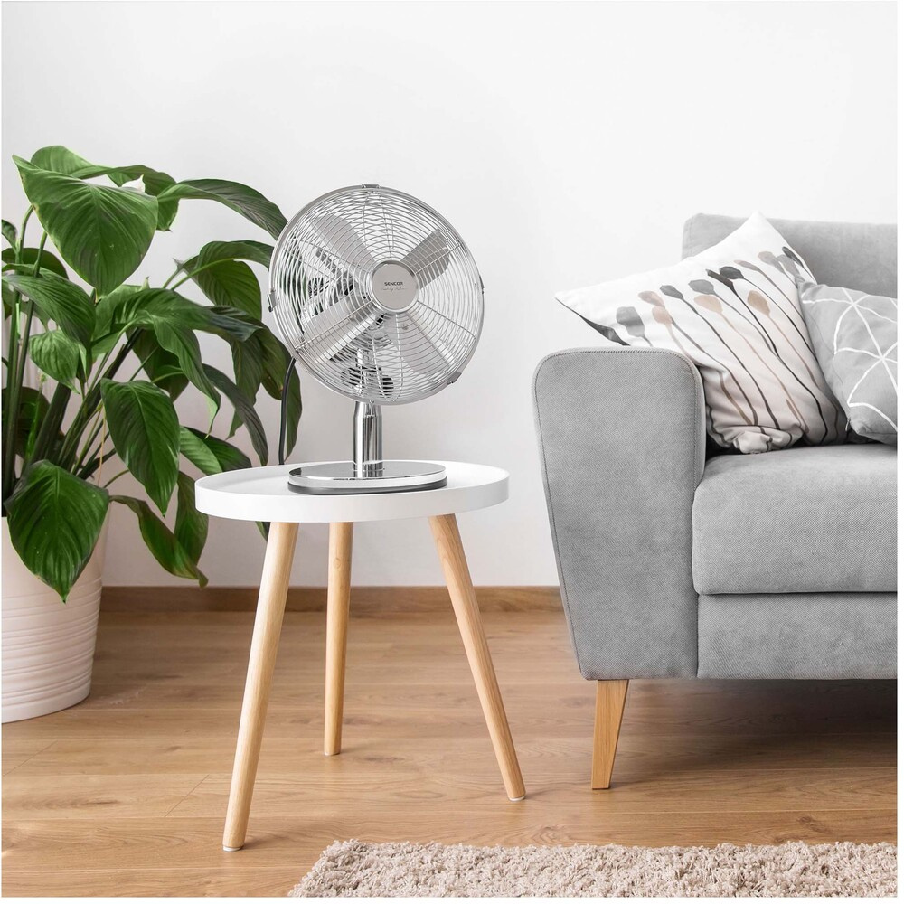 Cu un flux de aer puternic de 36,63 m³/min, acest ventilator de masă oferă o răcorire instantanee în zilele toride de vară. Cu dimensiunile sale compacte de 31 x 26 x 38 cm și designul cromat, acesta va deveni un ajutor elegant în casa sau biroul dvs. Consumul redus de energie de 30 W asigură o funcționare eficientă din punct de vedere energetic, menținând în același timp eficiența maximă de răcire.