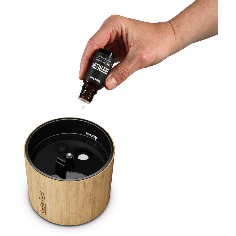 Bucurați-vă de efectele aromaterapiei cu uleiuri esențiale 100% pure de la Stadler Form sau Doterra. Puteți utiliza și alte uleiuri esențiale fără alcool în difuzorul de arome Nora.