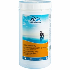 Tablete din clor Chemoform solubile lent 200g - Maxi 1 kg conțin mai mult de 80% clor activ. Aceste tablete conțin dezinfectant de clor și sunt destinate dozării pe parcurs a clorului. Pentru o calitate perfectă a apei, vă recomandăm să adăugați algicid și floculant în piscină.