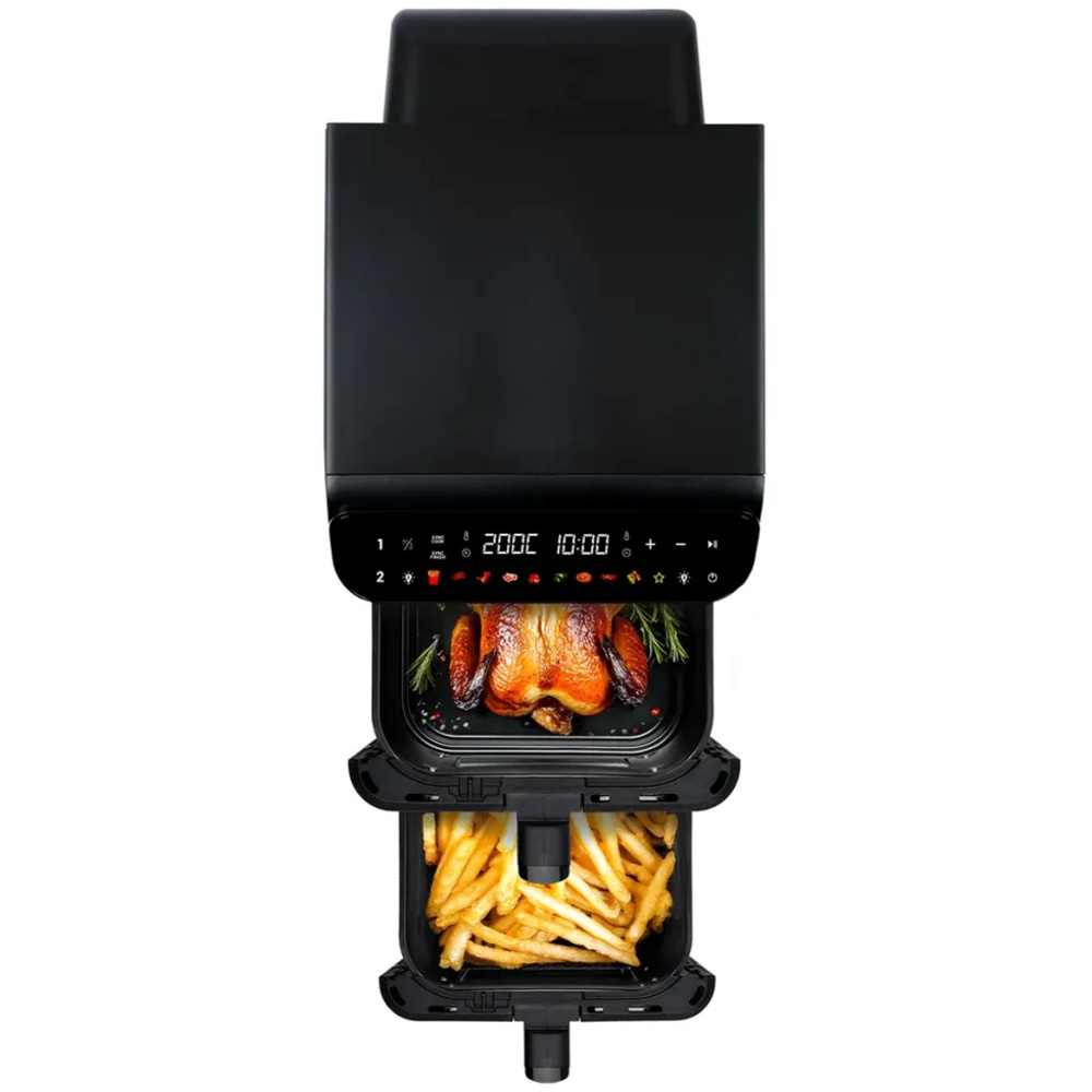 Frigider multifuncțional cu dispunere verticală economisește spațiu pe blatul de bucătărie și permite o organizare mai eficientă a spațiului. Două coșuri de 5,5 litri sunt așezate una peste alta, însă lățimea totală a dispozitivului nu depășește 26,5 cm. Designul compact nu limitează capacitatea în timp ce se potrivește ușor sub un dulap de bucătărie standard. Fiecare coș este echipat cu o fereastră de vizualizare cu iluminare, ceea ce facilitează verificarea procesului de gătire fără a-l deschide.