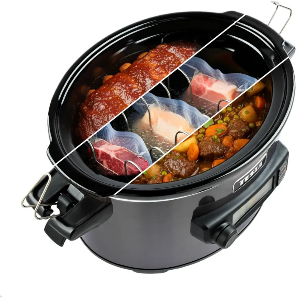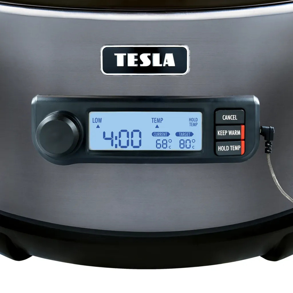 TESLA SlowCook S900 Plus este un ajutor de încredere pentru gătitul complet acasă, fără a sta îndelung la aragaz. Trebuie doar să introduceți ingredientele, să selectați temperatura și timpul, iar aparatul de gătit face restul. Datorită controlului precis al încălzirii, acesta poate gestiona și gătitul sous vide cu alimente sigilate în vid într-o baie de apă. O sondă de temperatură integrată monitorizează temperatura, iar capacul din sticlă cu mecanism de blocare îl face ușor de transportat în siguranță.