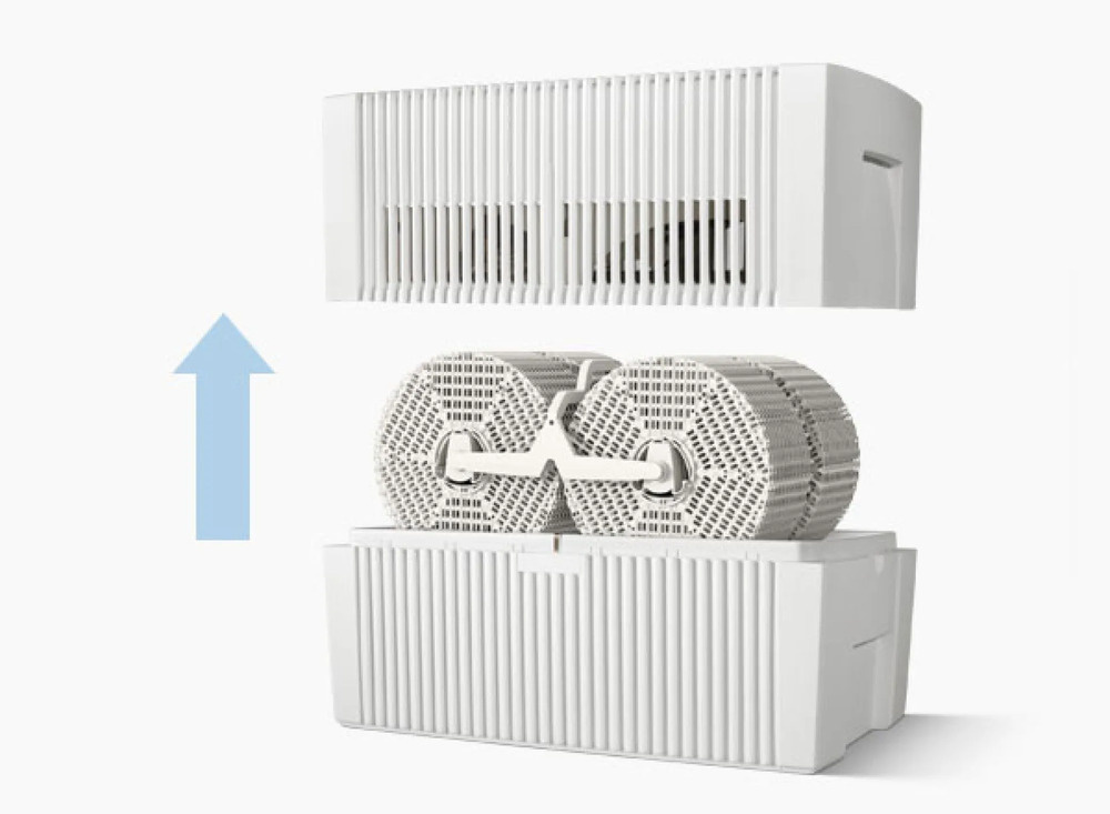 Apa pură se evaporă prin plăcile care se rotesc în jgheabul cu apă și umezește aerul din cameră. Această metodă de evaporare la rece este cea mai bună și mai igienică metodă de umidificare și, de asemenea, cea mai naturală modalitate de reducere a poluanților din aerul din cameră.