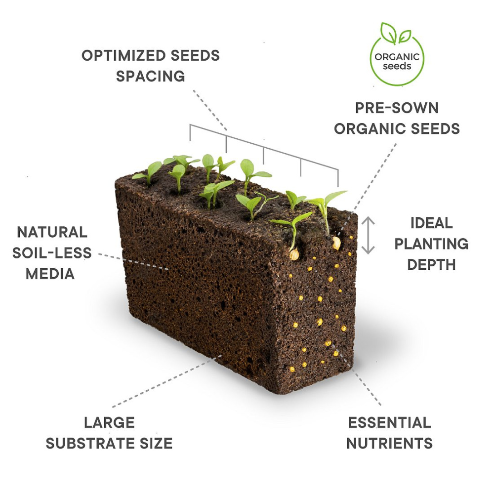 - Material: fibră de nucă de cocos, îngrășământ CE, semințe