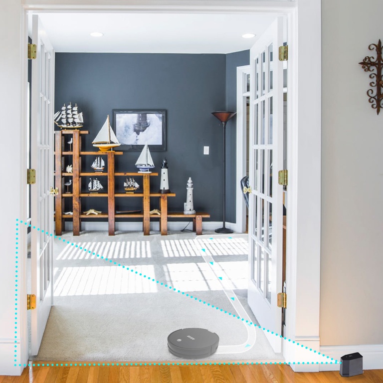 Peretele virtual creează un perete invizibil pe care aspiratorul robot nu îl poate traversa. De exemplu, puteți împiedica trecerea în camera alăturată, trecerea peste un covor cu părul înalt sau puteți să protejați obiectele fragile și să delimitați zona cablurilor. Funcționarea este asigurată de baterii AA de 2 x 1,5 V (nu sunt incluse).