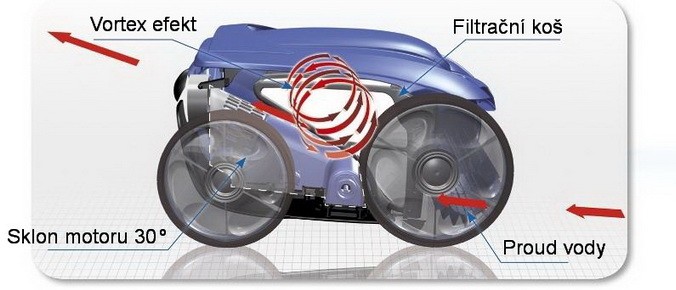 Datorită pozițiilor de schimb ale motorului pompei și a debitului hidraulic, se creează un efect vortex în interiorul filtrului. Impuritățile rămân în camera de filtrare, împiedicând filtrul să se înfunde. Această poziție unică a motorului a permis crearea primului robot de piscină cu o cameră de filtru ușor de utilizat. Impuritățile sunt colectate într-o cameră separată situată în partea de sus a dispozitivului. Rezultatul este forța și aspirația constantă pe tot parcursul ciclului de curățare și curățarea rapidă și igienică a filtrului.